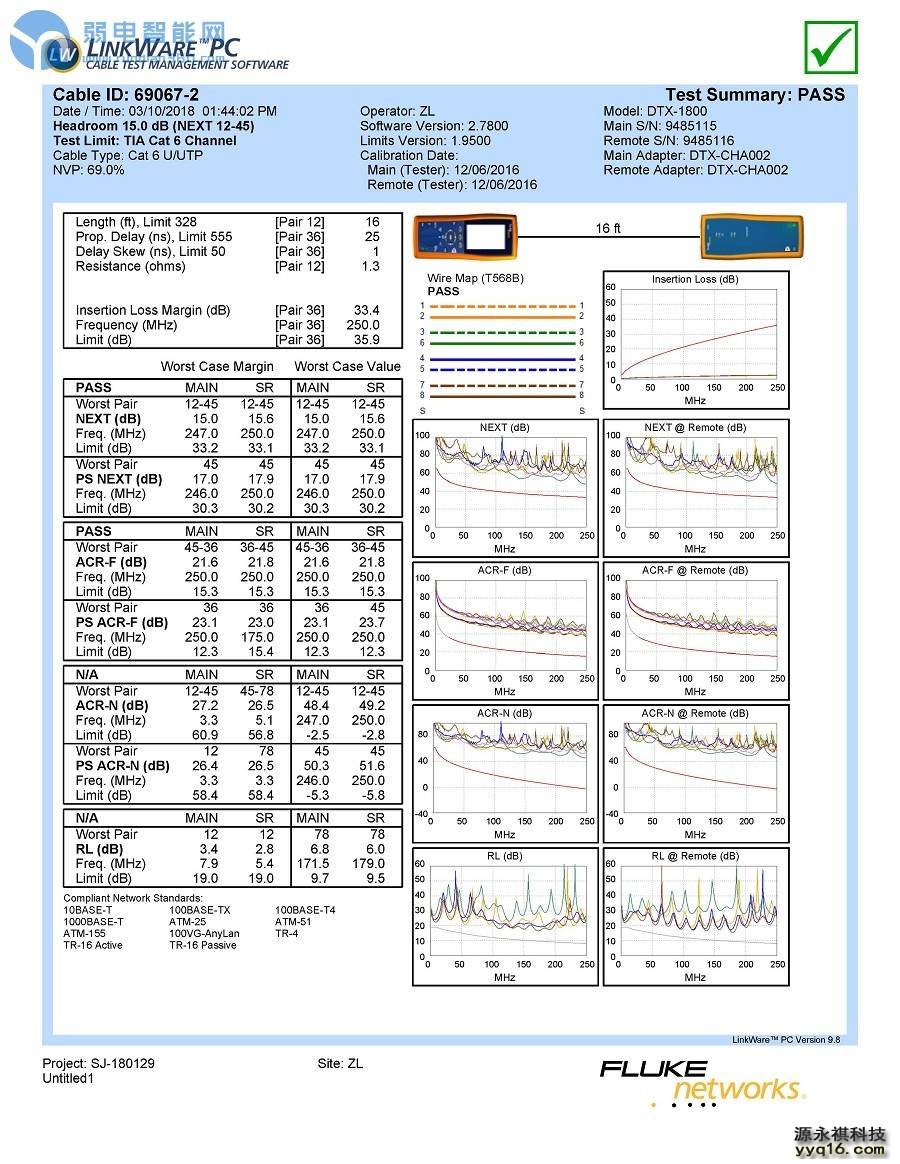 该报告证明了cat6网络跳线已通过福禄克信道测试。下图显得NEXT、PS NEXT、ACR-F、PS ACR-F、ACR-N、PS ACR-N和RL都在允许值内,并且NEXT和PL的值明显优于行业标准。