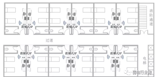 客房接入环境密集、墙壁阻隔较多,对无线信号的衰减相对较大,面板式AP推荐每个房间部署一台。如下图所示: