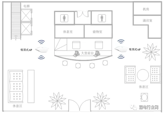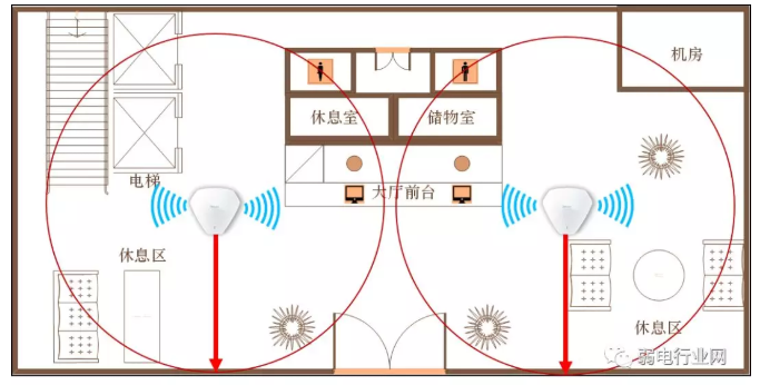 大堂相对空旷,阻隔物较少,吸顶式AP在空旷环境中覆盖直径20-30米,中小型宾馆大堂可根据具体结构布置2-3个AP即可,大型宾馆大堂可根据需求增加,如下图所示: